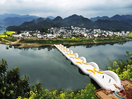 El puente de trampolín está construido sobre el agua y conecta los dos lados del río con la tensión de los neumáticos inflables. A diferencia del puente rígido tradicional, los transeúntes pueden saltar, rodar y saltar sobre él. A diferencia del hormigón armado o el puente de madera, en comparación con el trampolín de diversión, es más divertido jugar con agua.